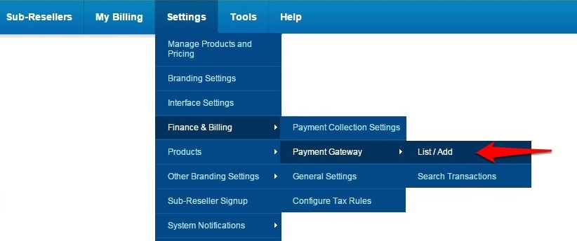 Click on Setting > Finance & Billing > Payment Gateway > List/Add